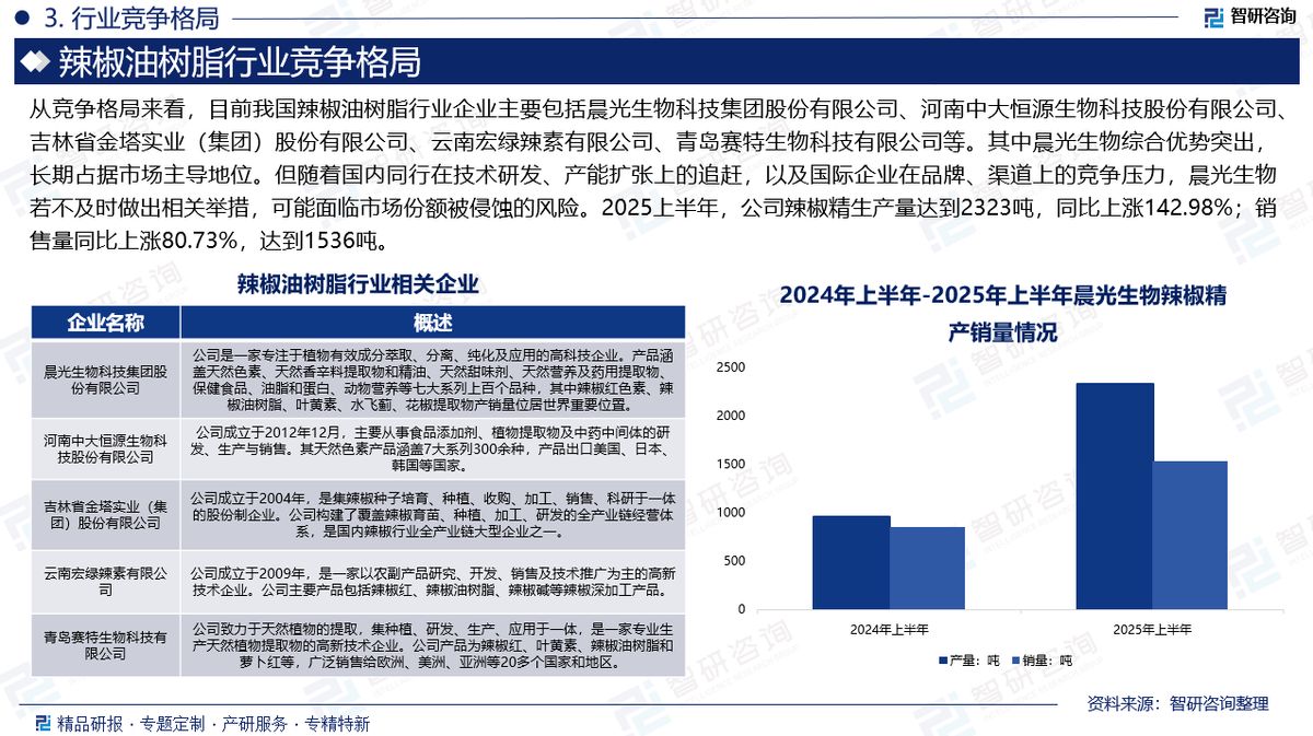 企业格局:从竞争格局来看,目前我国辣椒油树脂行业企业主要包括晨光生物科技集团股份有限公司、河南中大恒源生物科技股份有限公司、吉林省金塔实业(集团)股份有限公司、云南宏绿辣素有限公司、青岛赛特生物科技有限公司等。其中晨光生物综合优势突出,长期占据市场主导地位。但随着国内同行在技术研发、产能扩张上的追赶,以及国际企业在品牌、渠道上的竞争压力,晨光生物若不及时做出相关举措,可能面临市场份额被侵蚀的风险。