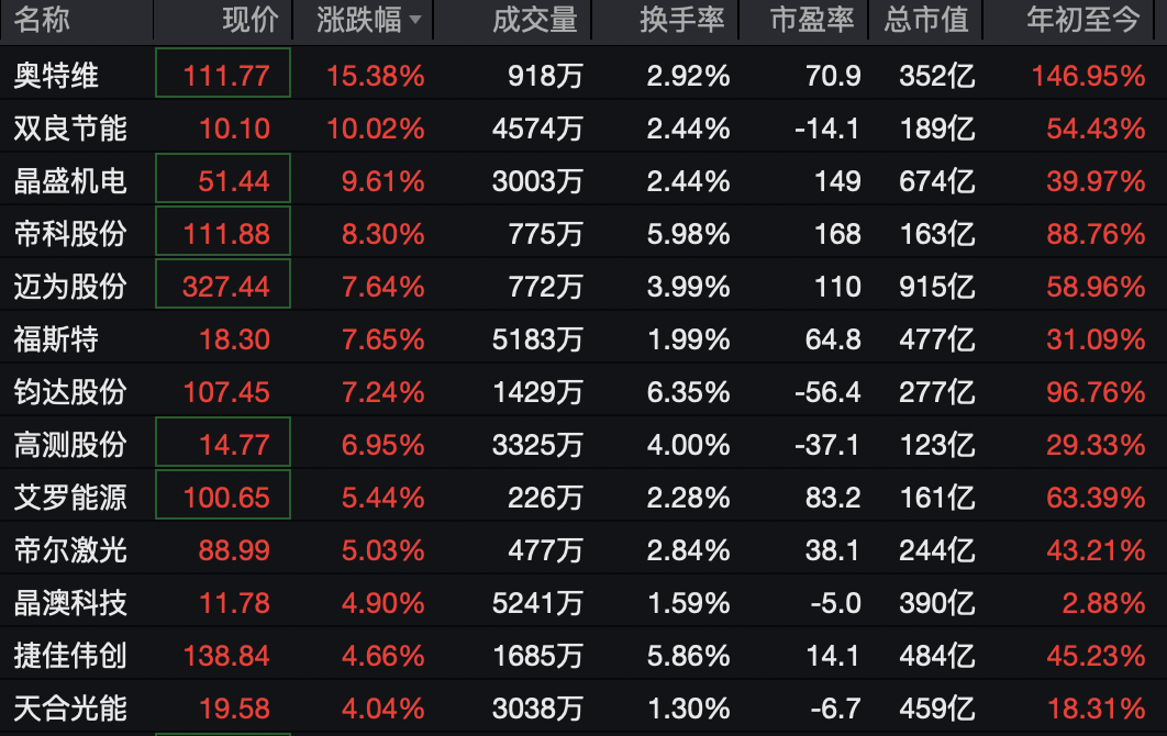光伏板块震荡拉升,奥特维涨超15%,双良节能涨停,晶盛机电、帝科股份、迈为股份等涨幅靠前。