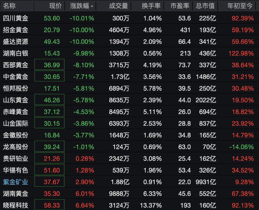 贵金属、黄金珠宝板块跌幅居前,概念股走势分化,四川黄金、招金黄金、盛达资源、湖南白银等纷纷跌停。而晓程科技、湖南黄金、紫金矿业率先反弹。