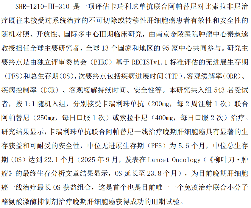 的SHR-1210-III-310三期临床攻入组543例受试者,1:1随机分组接受卡瑞利珠单抗+阿帕替尼或索拉非尼治疗,联合治疗组mPFS为5.6个月,mOS为22.1个月,为目前晚期肝细胞癌一线治疗最长OS获益组合。
