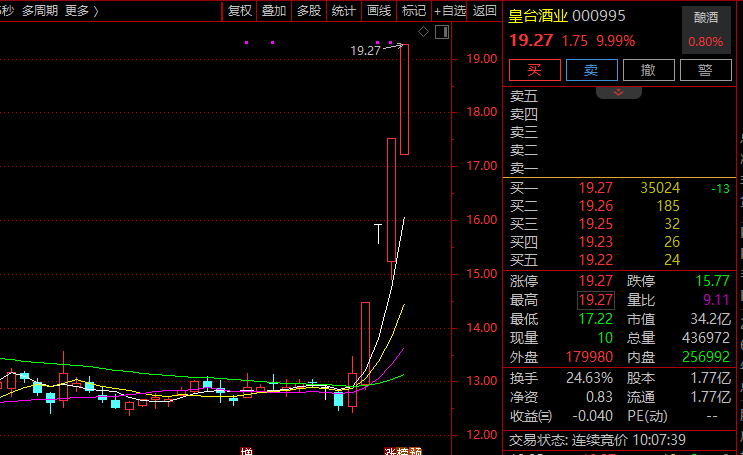 白酒概念反复活跃,皇台酒业(000995)4连板,金徽酒、贵州茅台、水井坊、会稽山、舍得酒业跟涨。