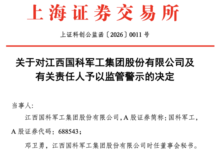 2月2日晚间,国科军工发布公告称,因涉及商业航天相关信息,存在信息披露不准确、不完整以及风险提示不充分等问题,公司及时任董事会秘书邓卫勇被上交所予以监管警示。