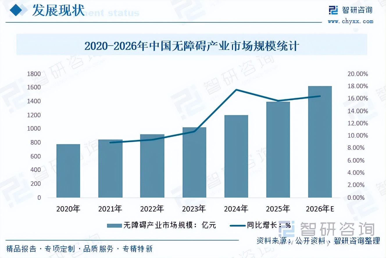 随着人口老龄化加速和残障群体需求升级,无障碍产业已从单纯的福利事业转变为具有巨大市场的经济增长点。据统计,2025年,我国无障碍产业市场规模从2020年的780亿元增长至1400亿元,预计2026年我国无障碍产业市场规模有望增长至1630亿元。