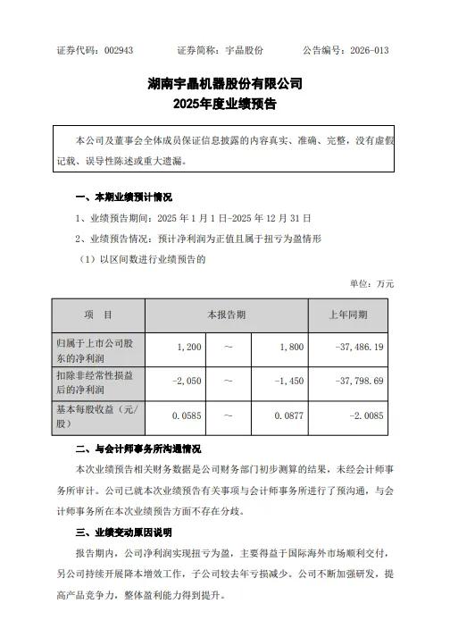 1月29日,宇晶股份(002943)发布2025年度业绩预告。预计2025年归属于上市公司股东的净利润1,200~1,800万元,上年同期为-37,486.19万元;预计2025年扣除非经常性损益后的净利润-1,450万元~-2,050万元,上年同期为-37,798.69万元。