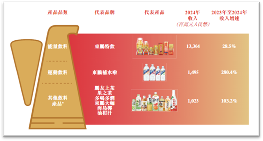根据弗若斯特沙利文报告,按销量计,东鹏饮料在中国功能饮料市场自2021年起连续4年排名第一,按零售额计,东鹏饮料是2024年第二大功能饮料公司,市场份额为23.0%。