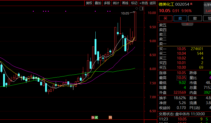 化工产业链早间全线走强,涨幅前10位的板块指数中有8家为化工产业子板块,其中分散染料、化纤、化学制品均大涨超3%,位居所有行业板块指数涨幅前三位。德美化工(002054)开盘仅约6分钟直线涨停,创近4年新高,百合花、闰土股份、沧州大化等纷纷强势涨停。