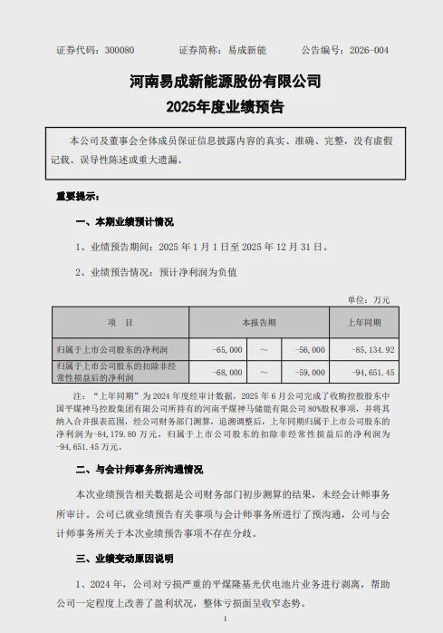 1月30日,易成新能(300080)发布2025年业绩预告。预计2025年归属于上市公司股东的净利润-56,000~-65,000万元,上年同期为-85,134.92万元。