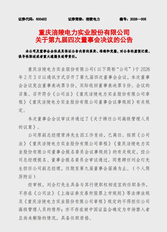公司原副总经理常涛先生因工作变动,已离任。按照《公司法》《重庆涪陵电力实业股份有限公司章程》《重庆涪陵电力实业股份有限公司董事会提名委员会议事规则》的有关规定,经公司总经理提名、董事会提名委员会审议通过,同意聘任刘会灯先生担任公司副总经理,任期至第九届董事会届满为止。