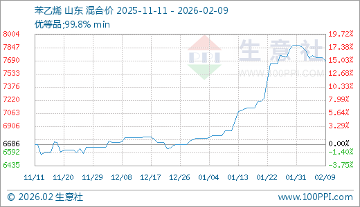 据生意社监测,苯乙烯02月09日最新价格7688.00元/吨,最近30天上涨12.23%,60天上涨13.56%。