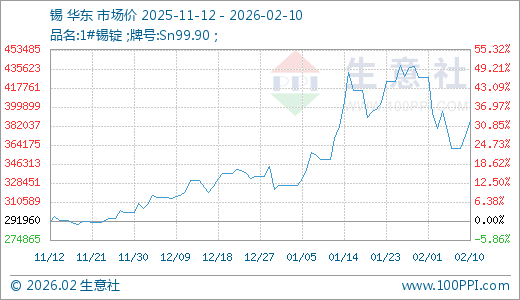 据生意社监测,锡02月10日最新价格387490.00元/吨,最近30天上涨10.53%,60天上涨17.08%。