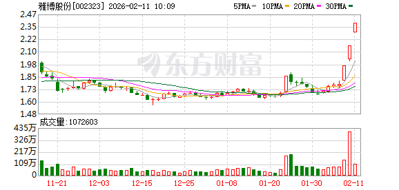 雅博股份盘中涨停,已连收3个涨停板,截至9:32,该股报2.38元,换手率4.31%,成交量9147.61万股,成交金额2.15亿元,涨停板封单金额为3.32亿元。连续涨停期间,该股累计上涨33.71%,累计换手率为30.12%。最新A股总市值达50.48亿元,A股流通市值50.47亿元。