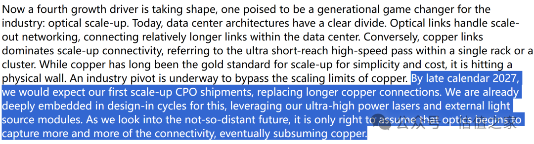 同时Lumentum表示,预计2027年四季度,关于Scale Up场景的CPO将大幅放量,展望不远的未来,可以合理推测CPO在Scale Up场景的渗透率会快速提升,最终完全代替铜线。