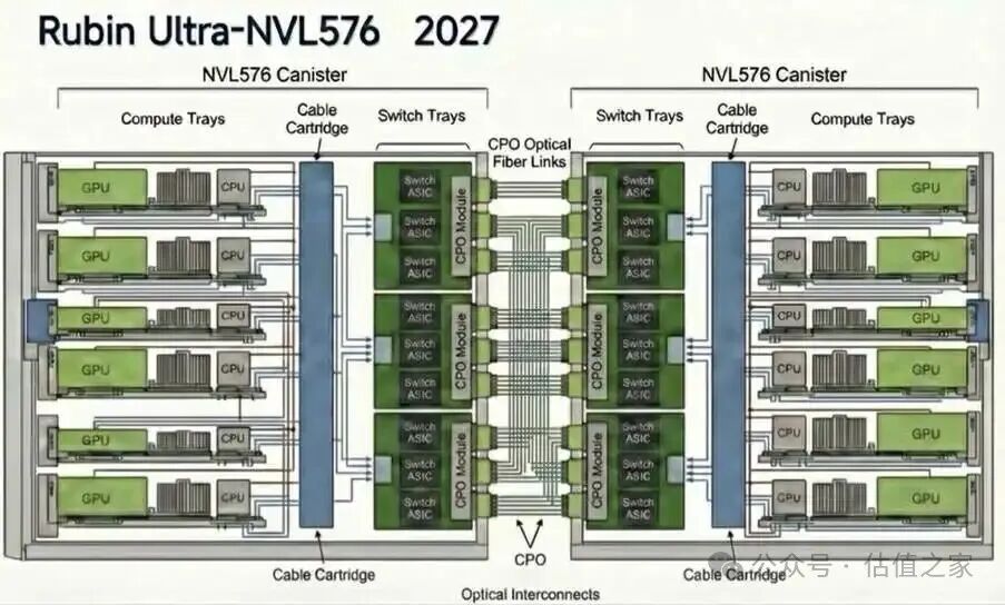 真正引起市场关注的是,“AYZ”在文章中直接给出了“Scale up CPO”方案下Vera Rubin Ultra机架的示意图,并表示Vera Rubin Ultra将采用NVL72 x 2配置,每个机架仍保留现有的NVL72机架设计,计算托盘和交换托盘通过铜线连接。然后,两个相邻机柜的NVSwitch托盘通过CPO和光纤互联,形成拥有144张GPGPU卡(或576个GPU芯片)的Vera Rubin Ultra机架,每个Vera Rubin Ultra GPGPU包含四个GPU芯片。