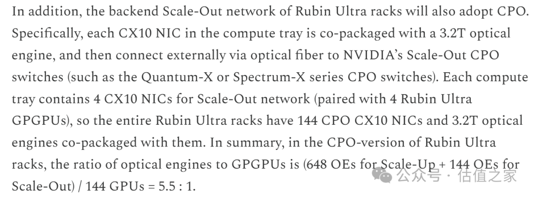此外,“AYZ”在文章中表示,Vera Rubin Ultra机架的Scale Out场景中也将采用CPO。具体来说,计算托盘的每个CX10网卡都与一个3.2T光引擎共同封装,然后通过光纤外部连接到NVIDIA的Quantum-X或Spectrum-X系列CPO交换机,每个计算托盘包含4个用于Scale out的CX10网卡(搭配4个Rubin Ultra GPGPU),因此整个Vera Rubin Ultra机架包含144个CPO CX10网卡和3.2光引擎。总的来说,在CPO方案下的Vera Rubin Ultra机架中,Scale Up场景使用了648个光引擎、Scale Out场景使用了144个光引擎,对应单个机架内144个GPGPU,光引擎与GPGPU的比例为5.5比1。