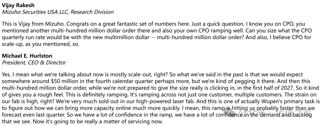 Lumentum在Earnings Call中表示,预计今年四季度会有大约5000万美元(可能更多)的CPO相关订单(主要是CW激光源等)转化为营业收入,同时在2027年上半年将有数亿美元(未透露具体规模)的CPO相关订单转化为营业收入(即对外出货)。