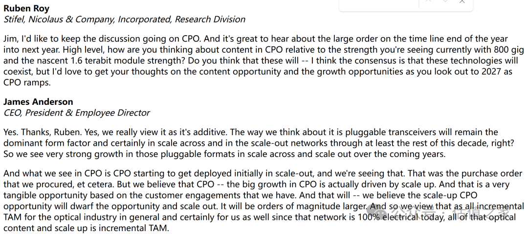 但是,Scale Out场景中,是否会大批量导入CPO方案,目前还存在较大分歧,至少无论Lumentum和Coherent都没有明确表示,未来Scale Out场景一定不会使用CPO方案,至少现在还没有充分的证据,能够完全证伪AYZ关于“Vera Rubin Ultra机架的Scale Out场景中也将采用CPO”这一结论。