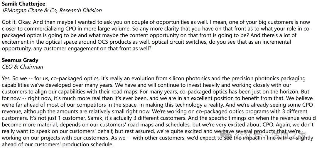 Fabrinet在Earnings Call中表示,过去多年以来CPO一直处于“未来”的状态,但目前公司已经感到“未来已来”。目前Fabrinet已经取得了一些关于CPO的营业收入,尽管目前金额相对较小。公司认为,在CPO的商业化方面,Fabrinet的技术和卡位远远领先于该领域的大多竞争对手,Fabrinet正在与三家不同的客户联合开发CPO项目,至于CPO营业收入何时放量,取决于客户的路线图和进度安排。