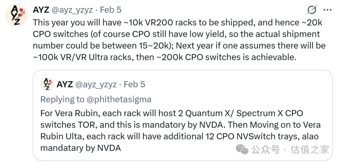 此后,AYZ在推特上进一步表示,在Vera Rubin机架中,英伟达将强制规定每个机架配备2台Quantum-X或Spectrum-X系列CPO交换机。而在Vera Rubin Ultra机架中,英伟达将强制规定每个机架将额外配备12个CPO NVSwtich托盘。