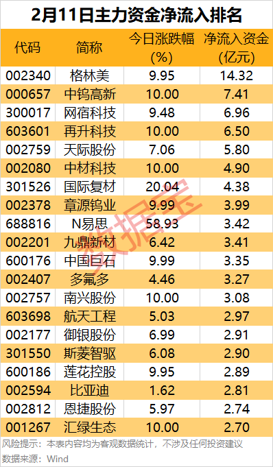 锂电材料股格林美主力资金净流入14.32亿元,居首,净流入额创2021年8月27日以来新高,股价涨停。