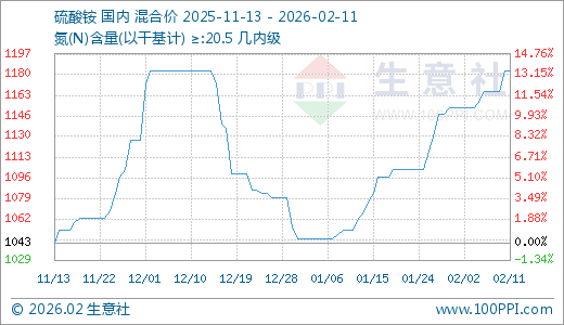 据生意社监测,硫酸铵02月11日最新价格1183.33元/吨,最近30天上涨11.29%。