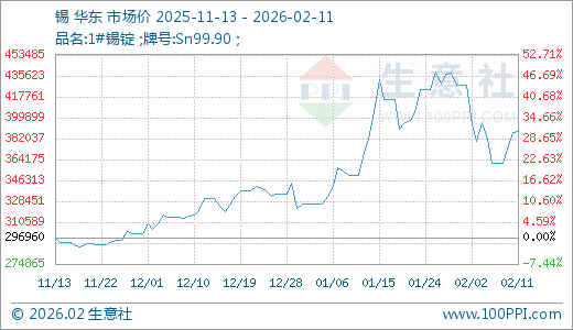 据生意社监测,锡02月11日最新价格388290.00元/吨,最近5天上涨7.70%,60天上涨17.32%。