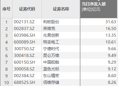 上证报中国证券网讯(记者 费天元)Choice数据显示,2月12日,资金净流入额排名前十的个股依次是利欧股份、英维克、兆易创新、特变电工、宁德时代、昆仑万维(维权)、中国船舶、蓝色光标、东山精密、佰维存储。其中,利欧股份获净流入31.63亿元。