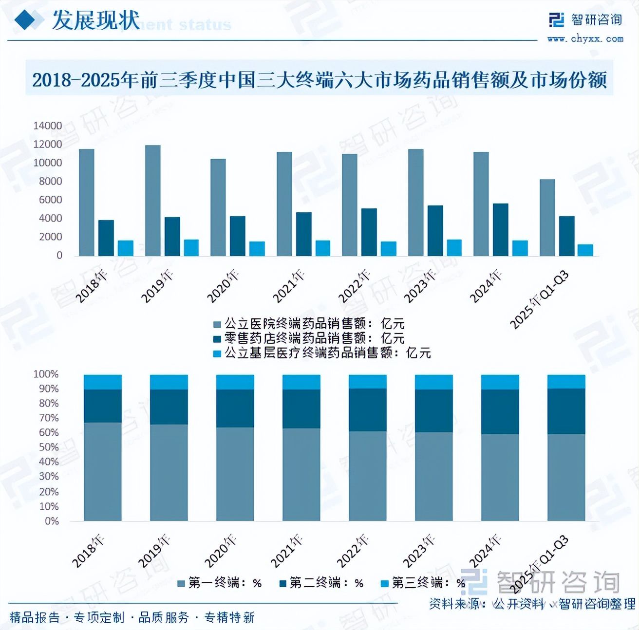 内容概要:医药终端指的是药品被消费者购买的市场。医药工业是关系国计民生和国家安全的重要产业。我国是世界工业医药大国,产业链完整,医药产品品种数量、生产能力位居全球前列。近年来,我国医药工业高质量发展成效显著,医药终端是药品流通的最终交付环节在中国医药市场的广阔天地中,长久以来,第一终端(公立医院)与第二终端(零售药店)一直占据着舞台的中心。中国药品终端市场近年来总体保持稳定增长,但增速有所放缓。2025年前三季度,我国医药三大终端六大市场药品销售总额达到13924亿元,其中,对公立医院终端药品销售额8290亿元,占终端销售额的59.5%;对零售药店终端药品销售额4385亿元,占终端销售额的31.5%;对公立基层医疗终端药品销售额1249亿元,占终端销售额的9.0%。