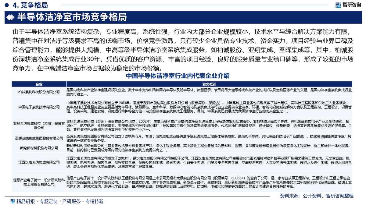 市场竞争格局:由于半导体洁净室系统结构复杂,专业程度高,系统性强,行业内大部分企业规模较小,技术水平与综合解决方案能力有限,普遍集中在对洁净等级要求不高的低端市场,价格竞争激烈,只有较少企业具备专业技术、资金实力、项目经验与业界口碑及综合管理能力,能够提供大规模、中高等级半导体洁净室系统集成服务,如柏诚股份、亚翔集成、圣晖集成等,其中,柏诚股份深耕洁净室系统集成行业30年,凭借优质的客户资源、丰富的项目经验、良好的服务质量与业绩口碑等,形成了较强的市场竞争力,在中高端洁净室市场占据较为稳定的市场份额。