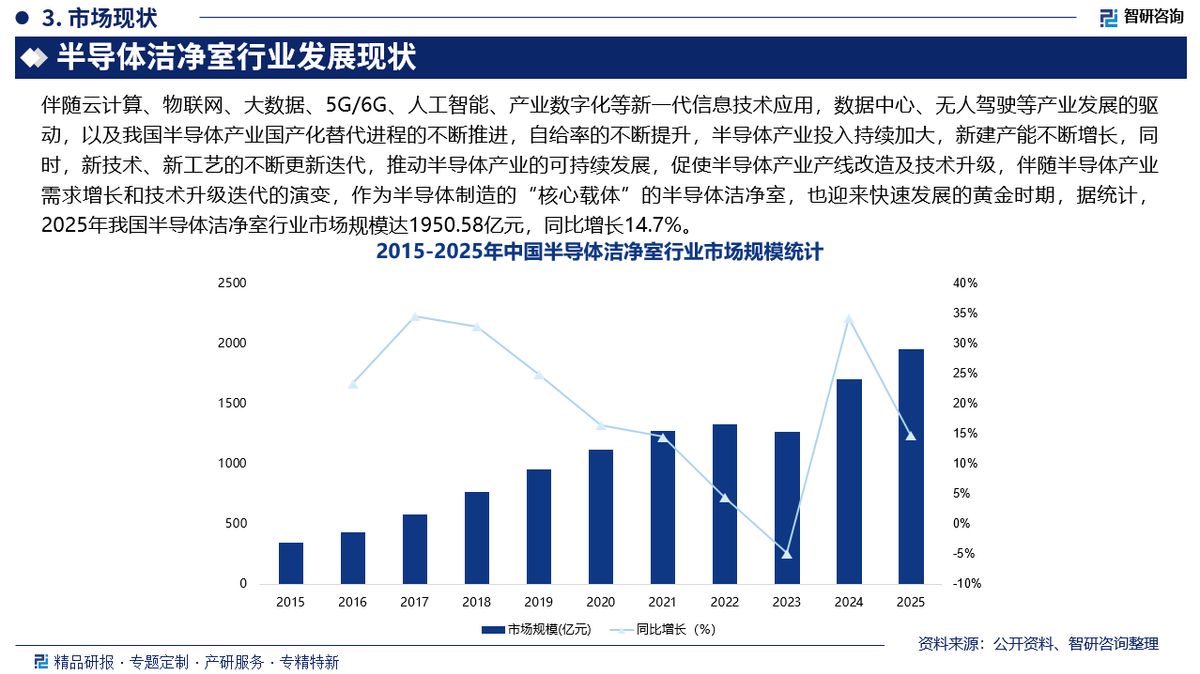 市场规模:伴随云计算、物联网、大数据、5G/6G、人工智能、产业数字化等新一代信息技术应用,数据中心、无人驾驶等产业发展的驱动,以及我国半导体产业国产化替代进程的不断推进,自给率的不断提升,半导体产业投入持续加大,新建产能不断增长,同时,新技术、新工艺的不断更新迭代,推动半导体产业的可持续发展,促使半导体产业产线改造及技术升级,伴随半导体产业需求增长和技术升级迭代的演变,作为半导体制造的“核心载体”的半导体洁净室,也迎来快速发展的黄金时期,据统计,2025年我国半导体洁净室行业市场规模达1950.58亿元,同比增长14.7%。