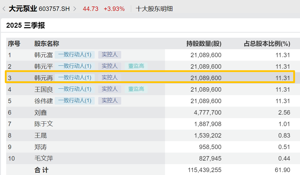 韩元再持有大元泵业2108.96万股股份,占总股本的11.31%,为大元泵业5名实际控制人之一。据悉,韩元再、韩元平、韩元富、王国良、徐伟建构成一致行动关系,为大元泵业的控股股东及实际控制人。其中,韩元再、韩元平与韩元富为兄弟关系。目前,韩元平为大元泵业的董事长。