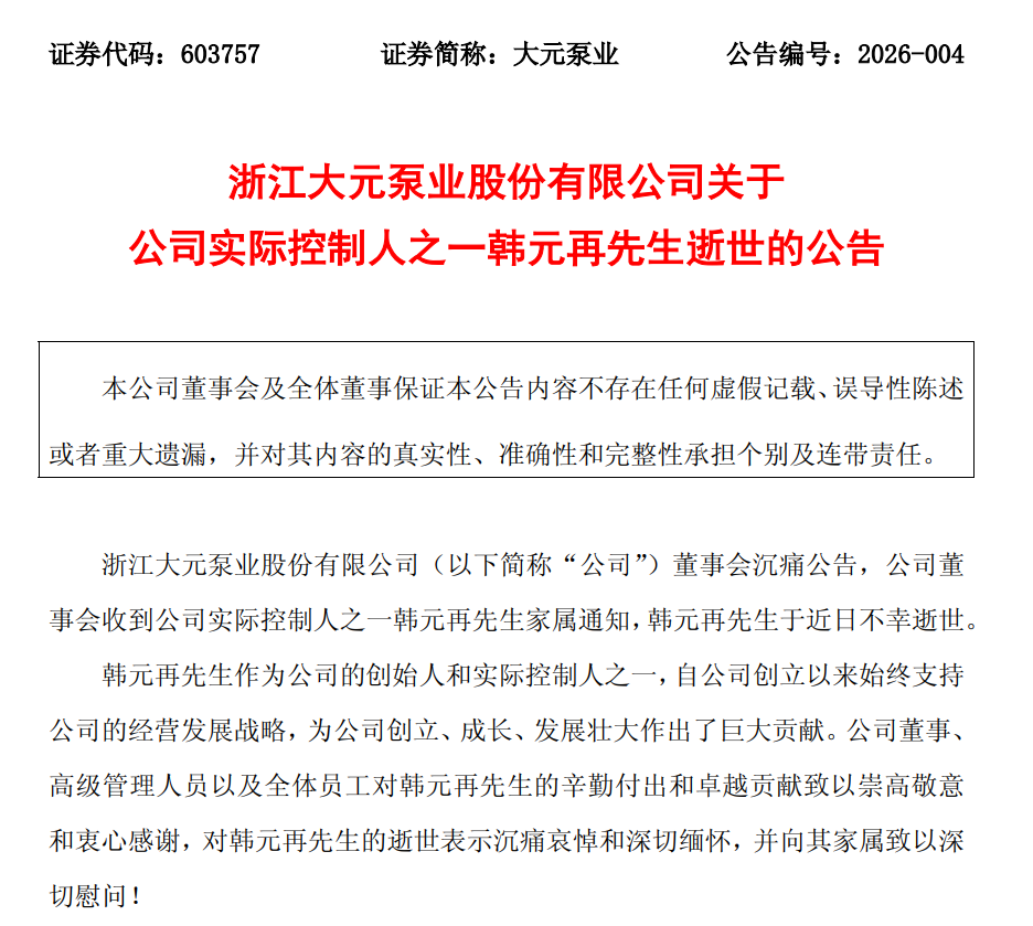 2026年2月25日,上交所主板上市公司浙江大元泵业股份有限公司(603757.SH)发布公告称,其董事会收到公司实际控制人之一韩元再先生家属通知,韩元再先生于近日不幸逝世。