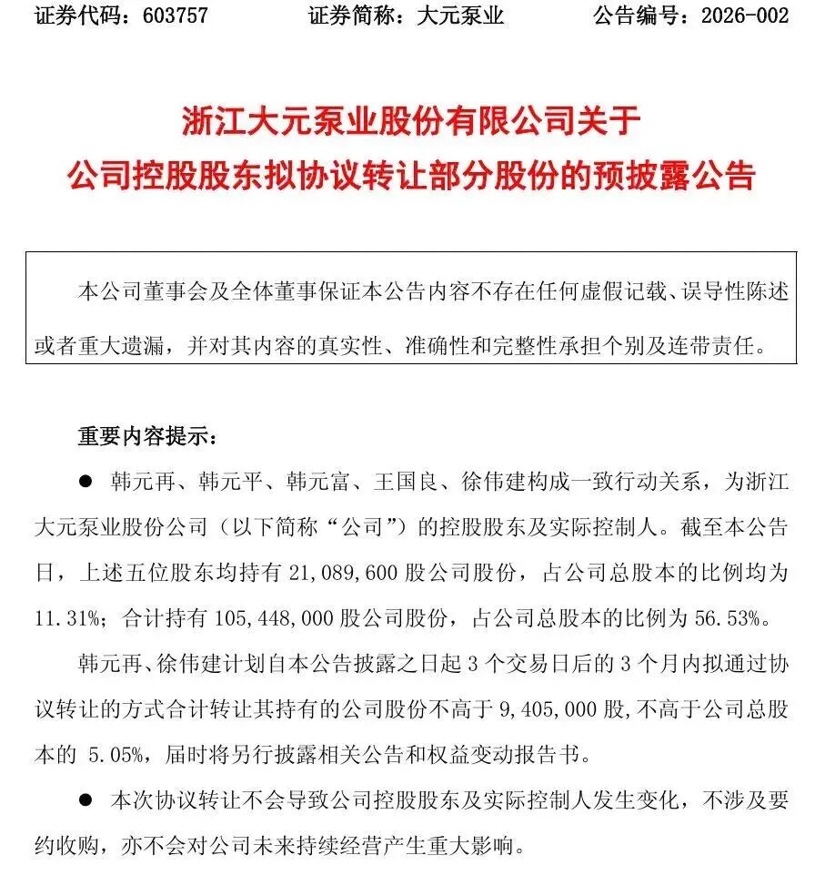 值得一提的是,2月9日晚间,大元泵业发布关于公司控股股东拟协议转让部分股份的预披露公告。韩元再、徐伟建计划自公告披露之日起3个交易日后的3个月内拟通过协议转让的方式合计转让其持有的公司股份不高于940.5万股,不高于公司总股本的5.05%。转让原因为满足股东自身资金需求,同时为优化公司股权结构,引入认可公司价值和看好公司未来发展的新投资者。