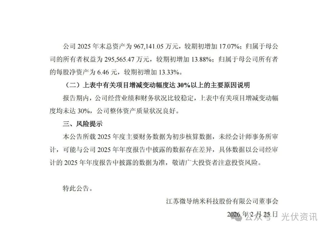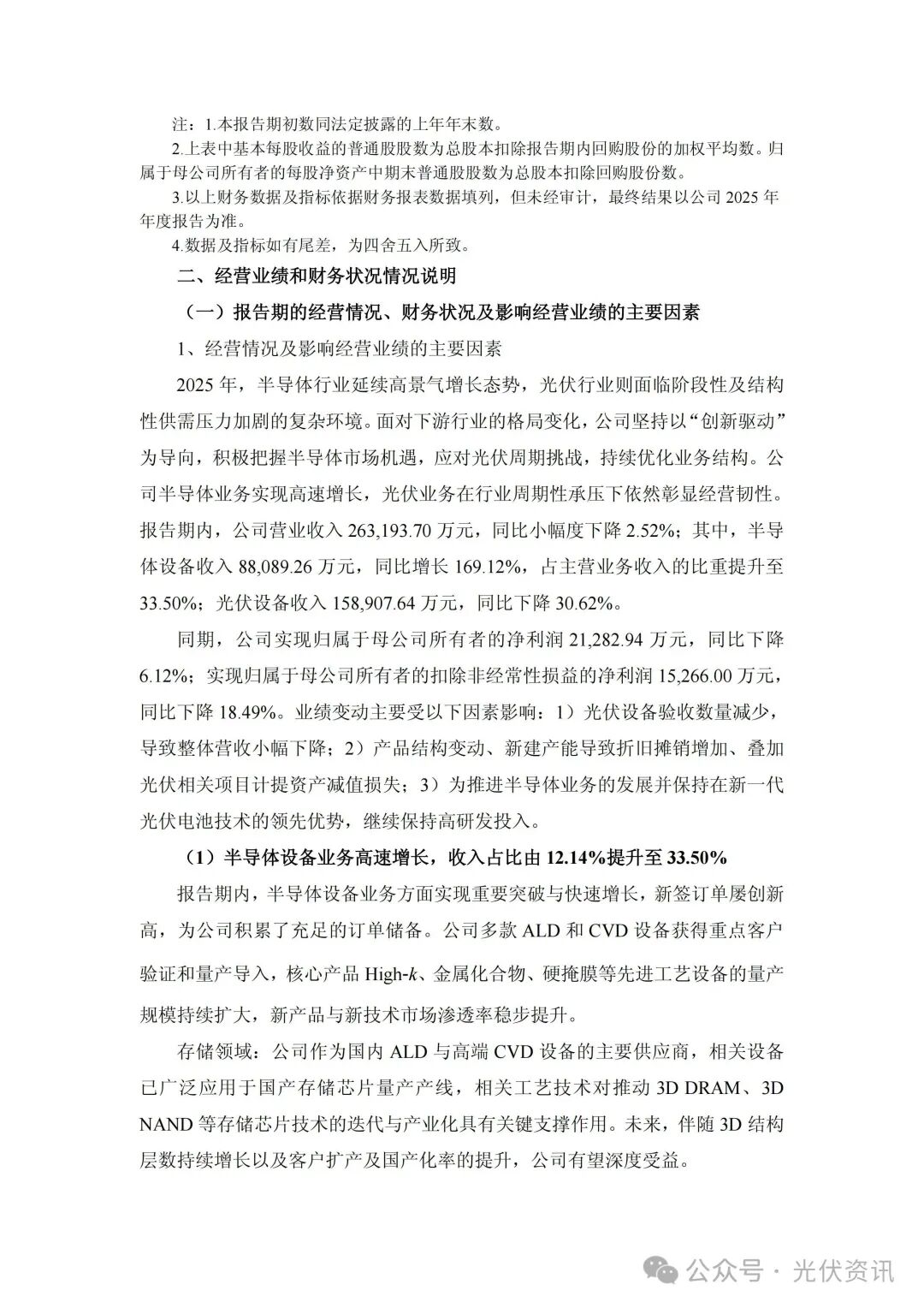 公告提到,2025年,公司坚持以“创新驱动”为导向,积极把握半导体市场机遇,应对光伏周期挑战,持续优化业务结构。公司半导体业务实现高速增长,光伏业务在行业周期性承压下依然彰显经营韧性。其中,半导体设备收入8.09亿元,同比增长169.12%,占主营业务收入的比重提升至33.50%;光伏设备收入15.89亿元,同比下降30.62%。