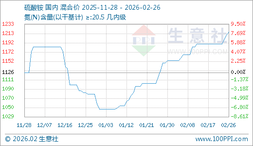 据生意社监测,硫酸铵02月26日最新价格1216.67元/吨,最近60天上涨12.65%。