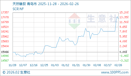据生意社监测,天然橡胶02月26日最新价格17000.00元/吨,最近5天上涨4.40%。