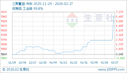 据生意社监测,三聚氰胺02月27日最新价格5970.00元/吨,最近5天上涨4.05%。