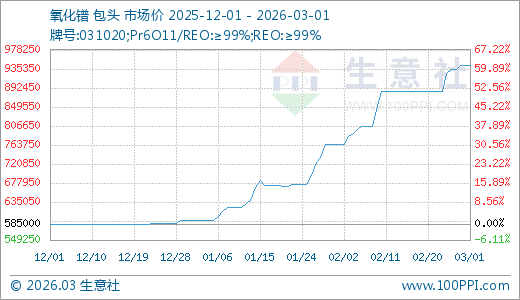 据生意社监测,氧化镨03月01日最新价格942500.00万元/吨,最近10天上涨6.50%,20天上涨11.54%,30天上涨23.20%,60天上涨59.07%。