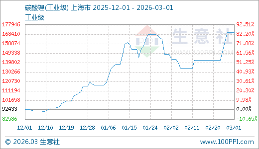 据生意社监测,碳酸锂03月01日最新价格173000.00元/吨,最近5天上涨13.82%,10天上涨19.31%,20天上涨27.21%,60天上涨44.89%。