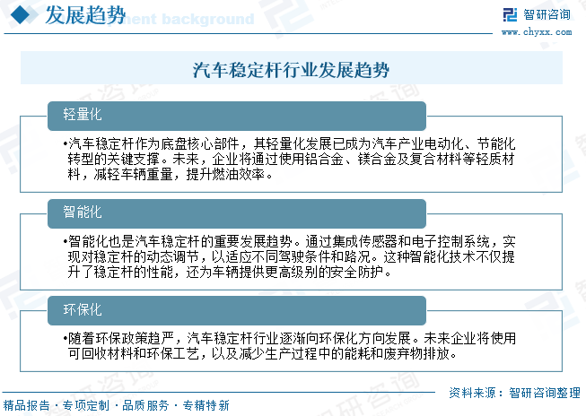 汽车稳定杆作为底盘核心部件,其轻量化发展已成为汽车产业电动化、节能化转型的关键支撑。未来,企业将通过使用铝合金、镁合金及复合材料等轻质材料,减轻车辆重量,提升燃油效率。同时,智能化也是汽车稳定杆的重要发展趋势。通过集成传感器和电子控制系统,实现对稳定杆的动态调节,以适应不同驾驶条件和路况。这种智能化技术不仅提升了稳定杆的性能,还为车辆提供更高级别的安全防护。此外,随着环保政策趋严,汽车稳定杆行业逐渐向环保化方向发展。未来企业将使用可回收材料和环保工艺,以及减少生产过程中的能耗和废弃物排放。