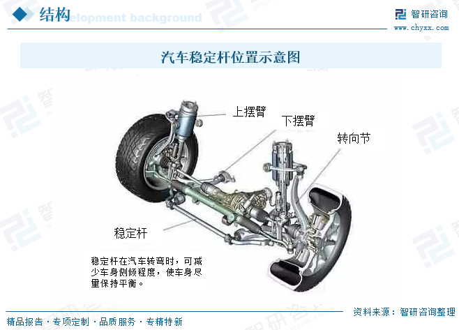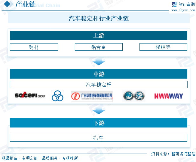 从产业链来看,汽车稳定杆行业上游包括钢材、铝合金、橡胶等原材料,这些原材料的波动将直接影响到中游的生产成本。中游是指汽车稳定杆的生产制造。下游需求主要集中在汽车领域,其产量与需求规模将直接影响汽车稳定杆的发展。