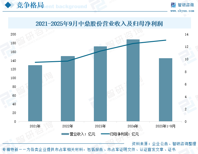 安徽中鼎控股(集团)股份有限公司创建于1980年,是以汽车零部件和机械基础件为主导的跨国民营企业集团。主要产品包括密封制品、减震制品、流体管、金属制品等,其中在减震制品方面,公司稳定杆衬套主要用于汽车前后稳定杆,起到支撑及固定减震降噪的作用。近年来,公司抓住新能源汽车产业发展的机遇,产品已经成功进入特斯拉、比亚迪、蔚来、理想、小鹏、广汽埃安等新能源汽车头部企业的供应链体系中。从企业经营业绩来看,2025年1-9月公司实现营业收入145.55亿元,同比上涨0.41%;归母净利润13.07亿元,同比上涨24.26%。