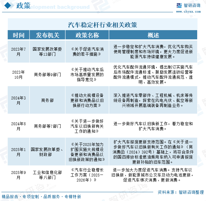 汽车稳定杆是现代汽车底盘系统中一个至关重要的组成部分,其性能直接影响车辆行驶的稳定性和操控性。随着消费者对汽车安全性和舒适性要求的提升,该行业在整车供应链中的地位日益凸显。近年来,我国政府出台了一系列汽车政策,如2023年7月,国家发展改革委等13部门发布《关于促进汽车消费的若干措施》,其中提出进一步稳定和扩大汽车消费,优化汽车购买使用管理制度和市场环境,更大力度促进新能源汽车持续健康发展。2025年9月,工业和信息化部等八部门发布《汽车行业稳增长工作方案(2025—2026年)》,其中提出进一步加大力度促进汽车消费。支持汽车以旧换新、新能源城市公交车及动力电池更新,促进汽车梯次消费、更新消费。在政策的推动下,汽车消费量将不断增加,进而推动汽车稳定杆等零部件的需求增加。