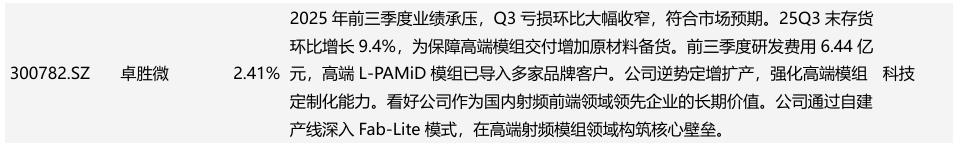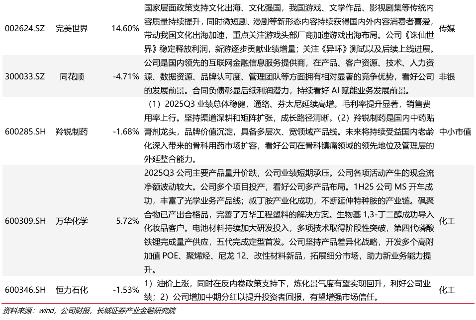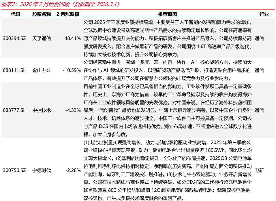 2月组合平均涨跌幅为+4.60%,其中天孚通信(+48.41%)、完美世界(+14.60%)、万华化学(+5.72%)等表现相对优秀。