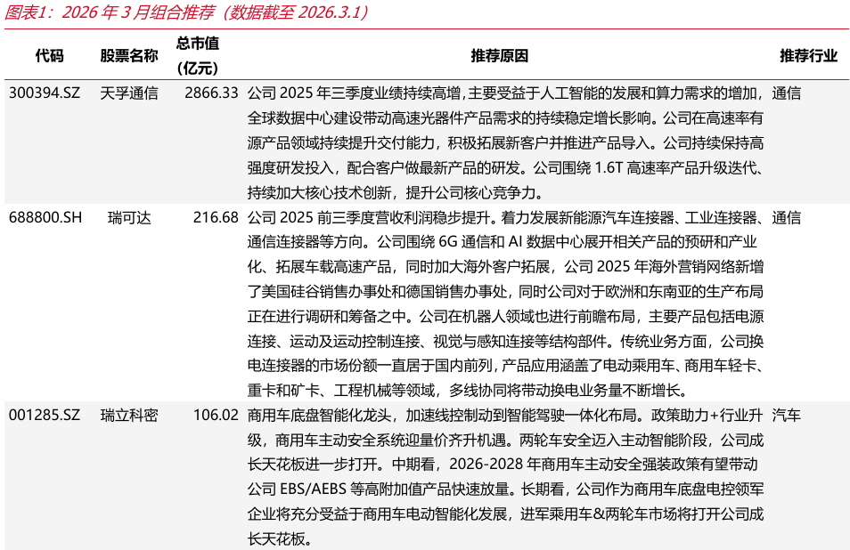3月组合:天孚通信、瑞可达、瑞立科密、科士达、福能股份、晨光生物、路德科技、同花顺、万华化学、恒力石化。重点覆盖通信、汽车、电新、公用事业、中小市值、非银、化工等行业。