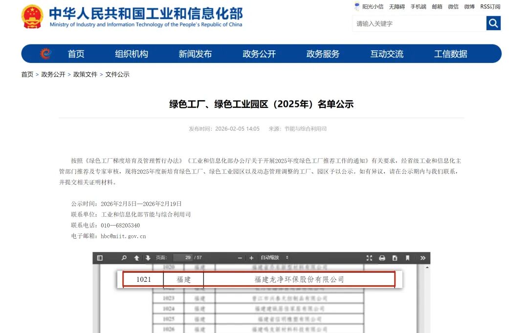 近日,工业和信息化部正式发布了2025年度国家级绿色工厂、绿色工业园区名单,龙净环保凭借扎实的绿色发展基础、领先的绿色生产技术及完备的能源管理体系,成功获评“国家级绿色工厂”。此次获评,是公司继荣获“省绿色工厂”称号后,在绿色制造和低碳发展领域获得的又一国家级权威认证,既是对公司长期践行绿色发展理念的充分肯定,也是对公司绿色低碳实践成果的高度认可。