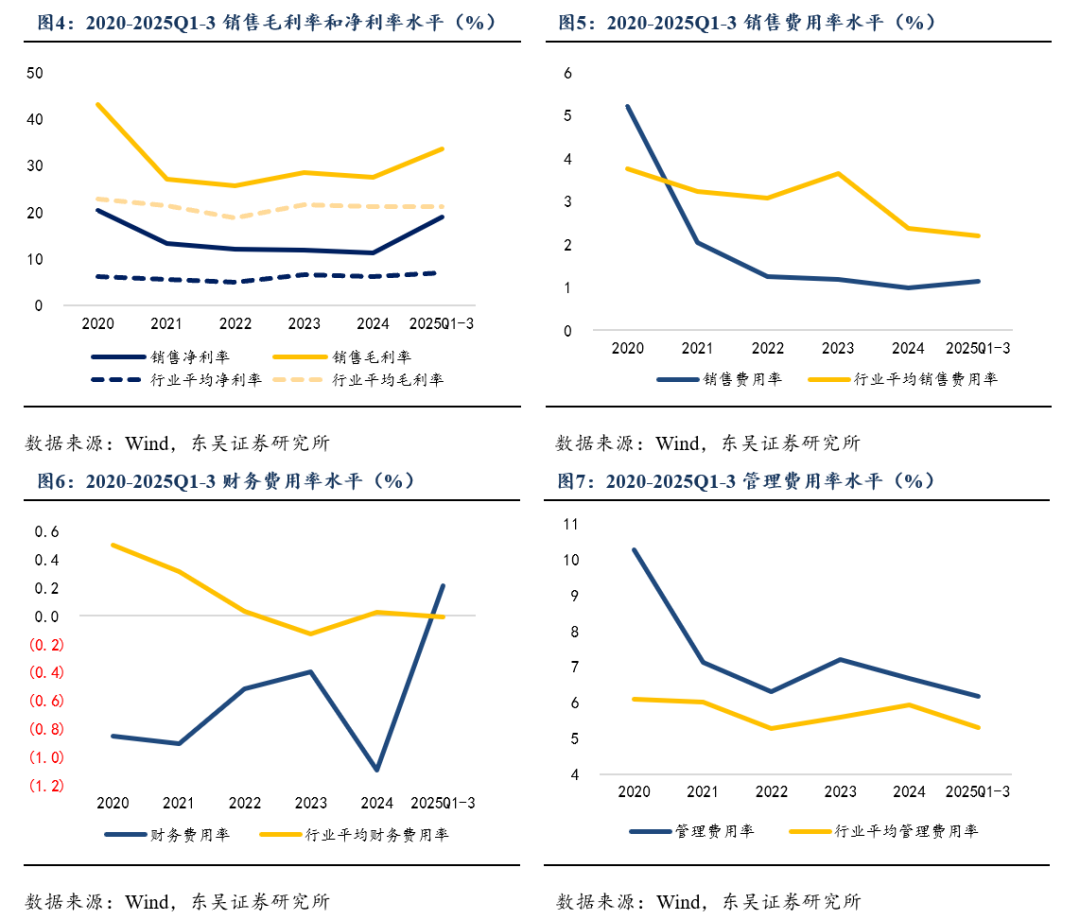 公司销售净利率和毛利率上升,销售费用率维持稳定,财务费用率上升,管理费用率下降。2020-2024年,公司销售净利率分别为26.43%、13.33%、12.13%、11.91%和11.30%,销售毛利率分别为43.76%、26.99%、25.70%、28.39%和27.47%。