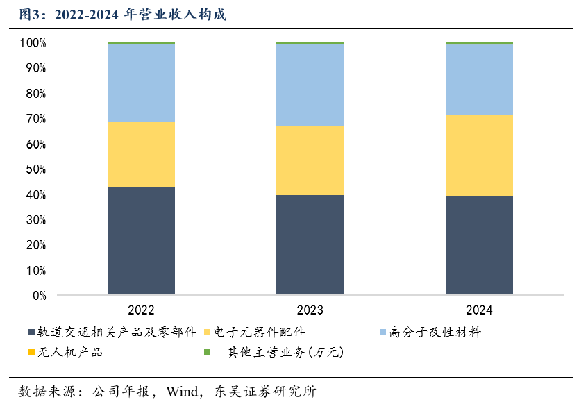 公司营业收入主要来自轨道交通相关产品及零部件、电子元器件配件、高分子改性材料及无人机配套产品。2022-2024年,轨道交通相关产品及零部件收入分别为25,728.25万元、25,241.17万元及26,257.19万元,占各期营业收入比重分别为42.41%、39.40%、39.32%,整体保持在较高水平。