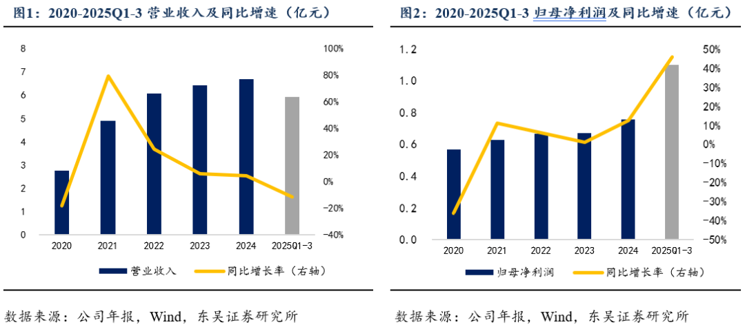 2020年以来公司营收稳步增长,2020-2024年复合增速为23.75%。自2020年以来,公司营业收入总体呈现稳步增长态势,同比增长率“V型”波动,2020-2024年复合增速为23.75%。2024年公司实现营业收入6.68亿元,同比增加4.22%。与此同时,归母净利润也不断浮动,2020-2024年复合增速为7.45%。2024年实现归母净利润0.75亿元,同比增加12.44%。