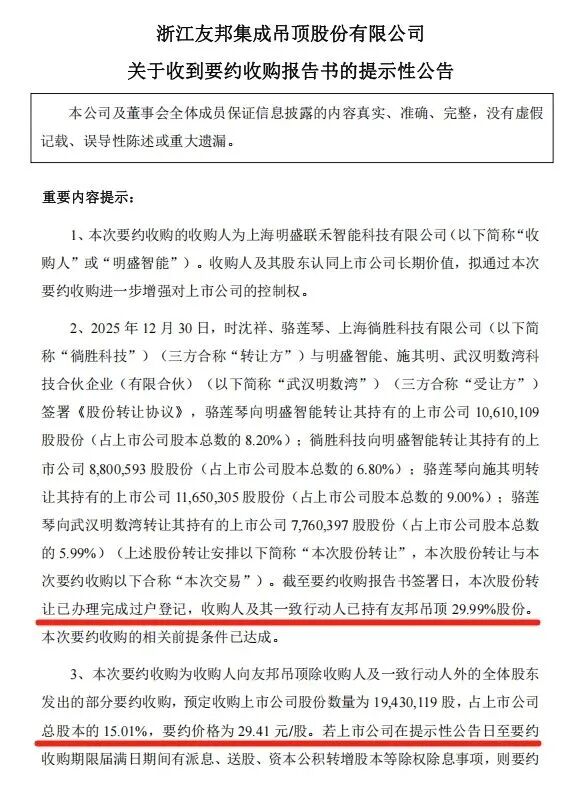 2月24日,友邦吊顶(002718)发布《关于收到要约收购报告书的提示性公告》。公告称,明盛智能向友邦吊顶全体股东发出部分要约收购,计划收购股份数量1943.01万股,占公司总股本的15.01%,要约价格为29.41元/股。本次要约收购完成后,明盛智能合计持股比例将达45%,成为友邦吊顶新控股股东。