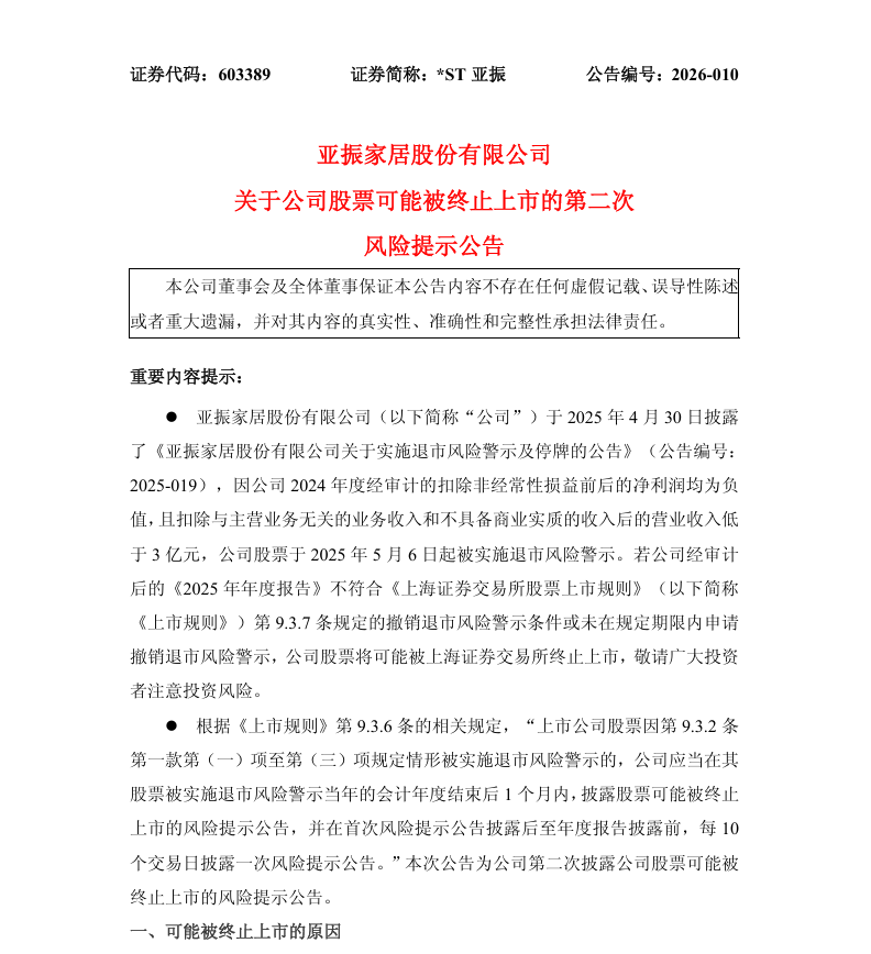 《亚振家居股份有限公司关于公司股票可能被终止上市的第二次风险提示公告》显示,若2025年年度报告经审计后不符合撤销退市风险警示条件或未在规定期限内申请撤销,公司股票可能被终止上市。1月31日,亚振家居发布2025年年度业绩预告,相关财务数据为初步测算,最终以经审计的年度报告为准。